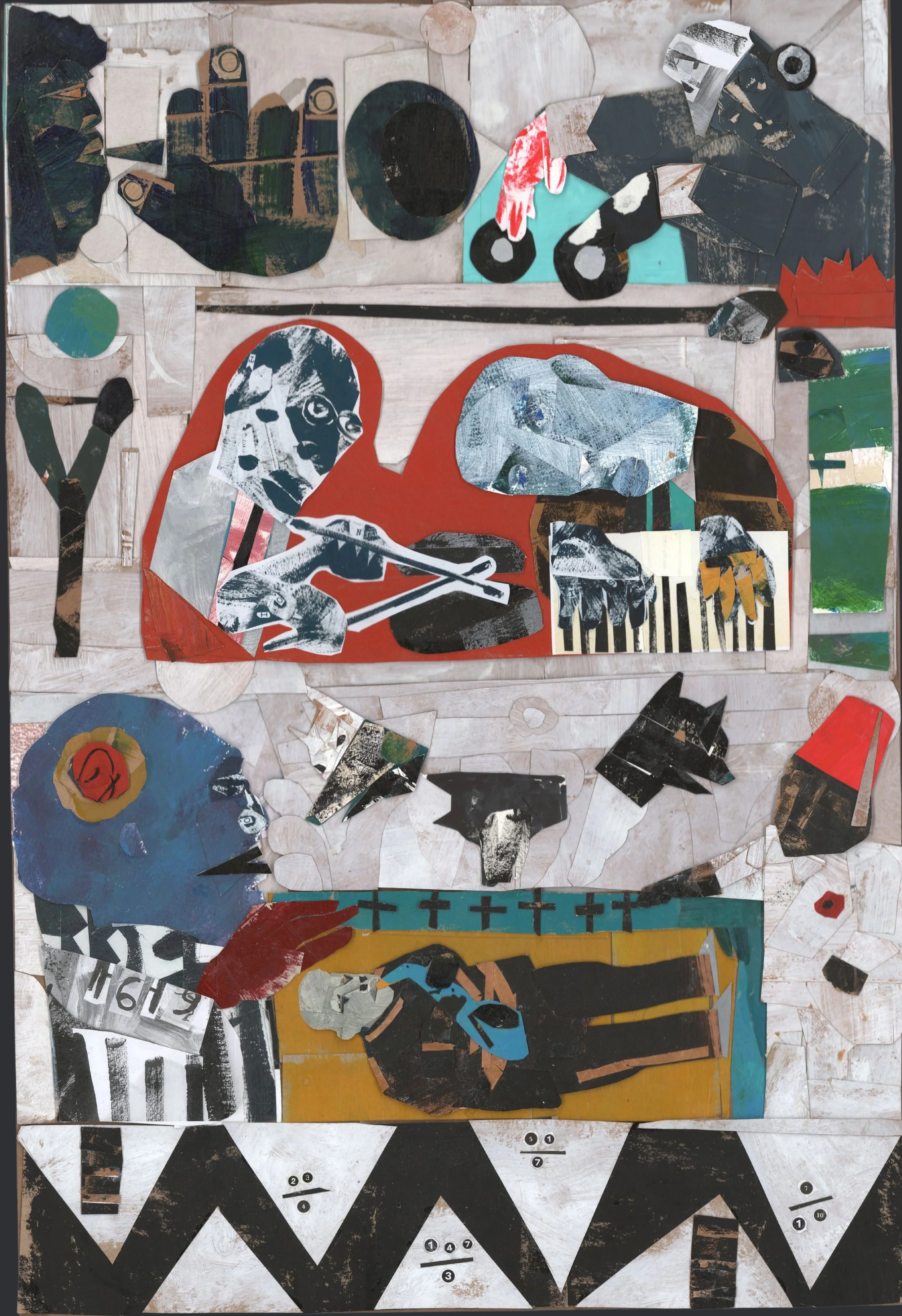 Next, we encounter the practitioners of jazz as they embark on the Herculean task of breaking free from the conformity of the Swing Era, the constraints of segregation, and the white dominance of the music industry. Pushing the frontiers of sound, the emergence of Bebop rises to meet this challenge and is depicted by two musicians: one on drums and the other on piano as they perform at breakneck speed, embodying a David-and-Goliath struggle. Bebop is represented here by a slingshot and stone to the left, while to the right stands the Philistine giant, marked by a protruding eye, a red headdress, and a pointed sword.