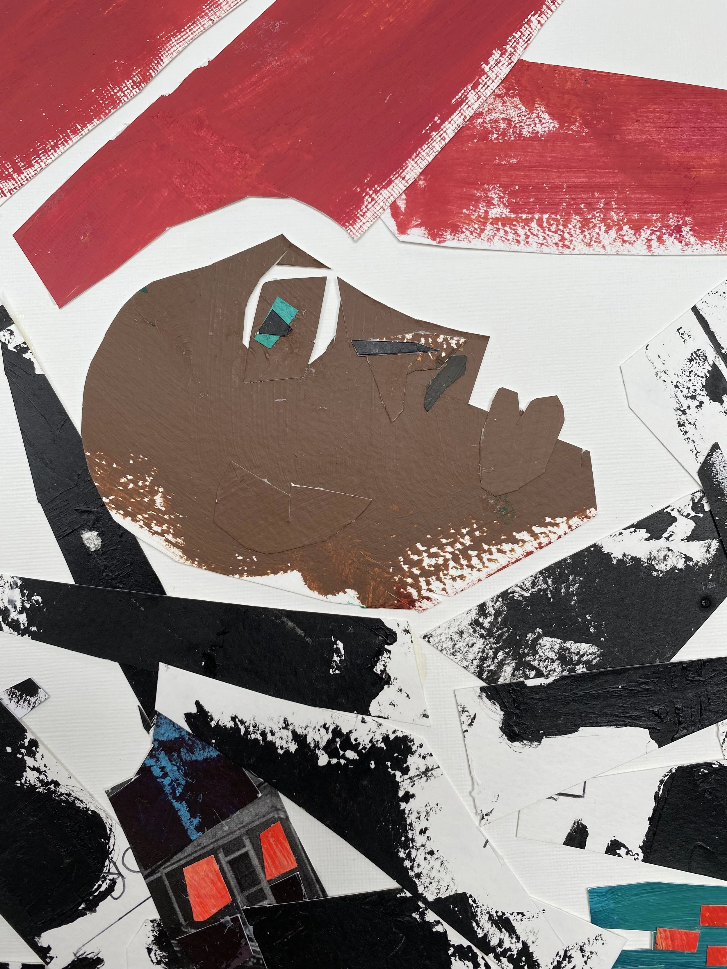 The Black neighborhood of Greenwood in Tulsa Oklahoma popularly known as the “Black Wall Street” and was plundered by white mob violence due to an unsubstantiated claim that a young black teenager sexually assaulted a white woman (think Emmit Till, Central Park 5 etc) during the summer of 1921. This collage depicts the plunder, destruction of property, death and displacement as well as a plane above which dropped incendiary bombs (first ariel bombing on US soil before Pearl Harbor) reducing this once thriving area to a memory.